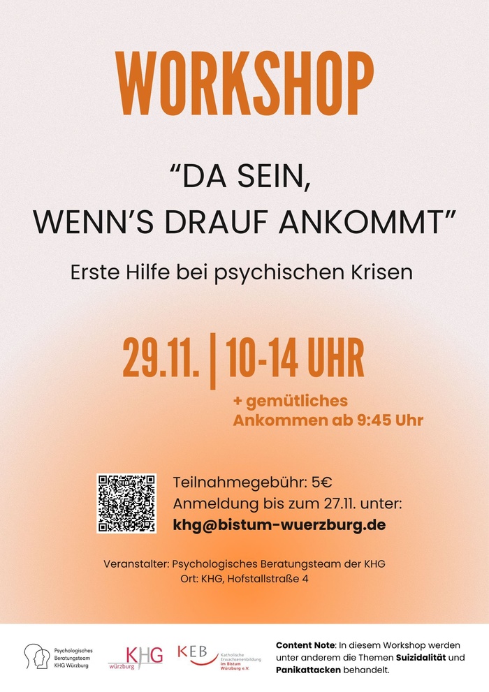 Mit einem Raum für Fragen, Austausch und Übungen möchten wir dir zeigen, wie du Warnsignale erkennen, Sorgen ansprechen und in akuten Situationen unterstützend handeln kannst. Dabei soll es auch darum gehen, deine eigenen Bedürfnisse nicht aus dem Blick zu verlieren.
