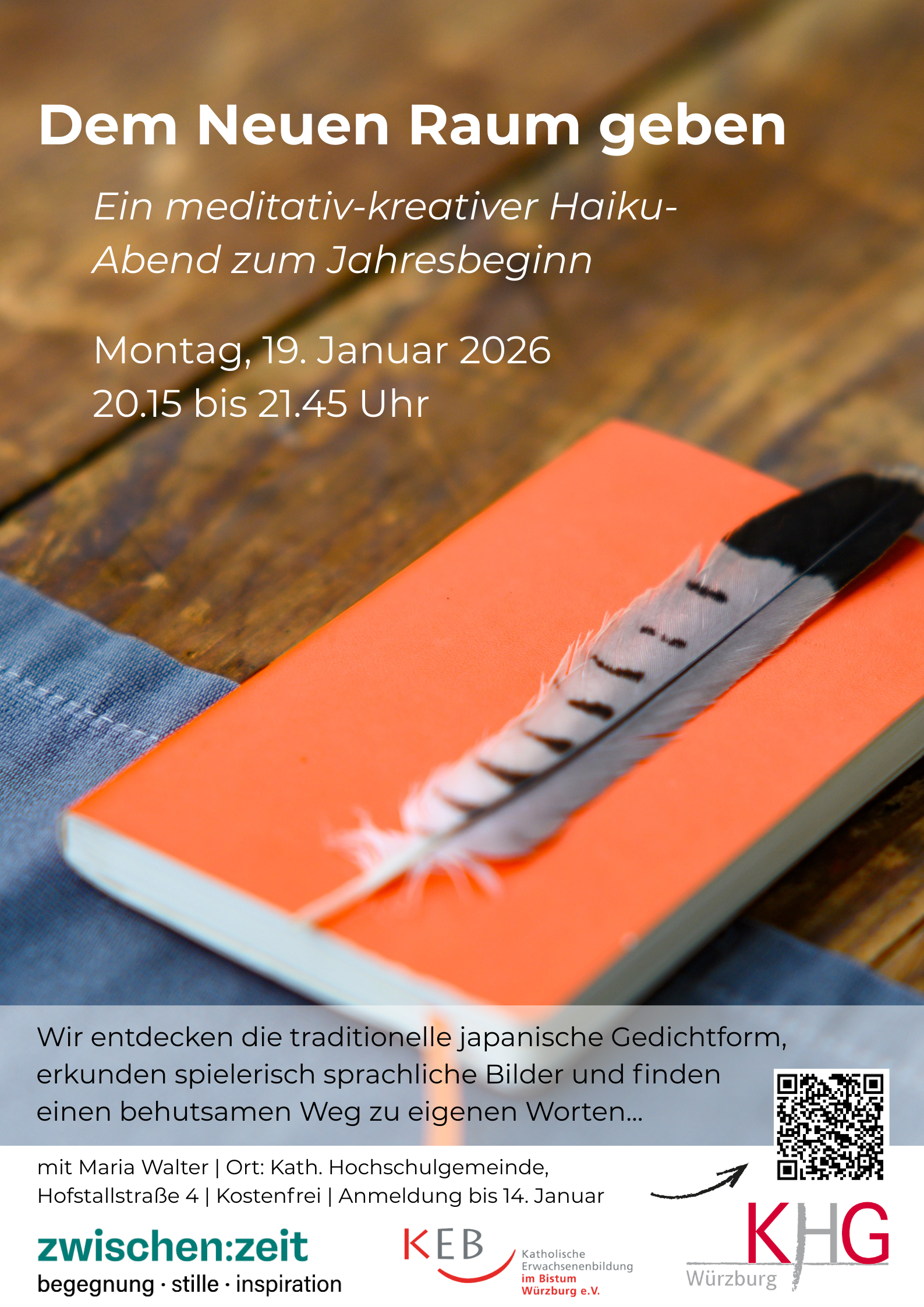 Die ersten Wochen des neuen Jahres laden ein zum Innehalten, zur Stille und zum schöpferischen Aufbruch. Dieser Abend eröffnet einen meditativen Zugang zur Form des Haikus, einer traditionellen japanischen Gedichtform, die in drei Zeilen Natur, Augenblick und Empfindung zum Klingen bringt. Im Fokus stehen das ruhige Wahrnehmen, das spielerische Erkunden sprachlicher Bilder und der behutsame Weg zu eigenen Worten. Impulse, Beispiele und einfache kreative Übungen