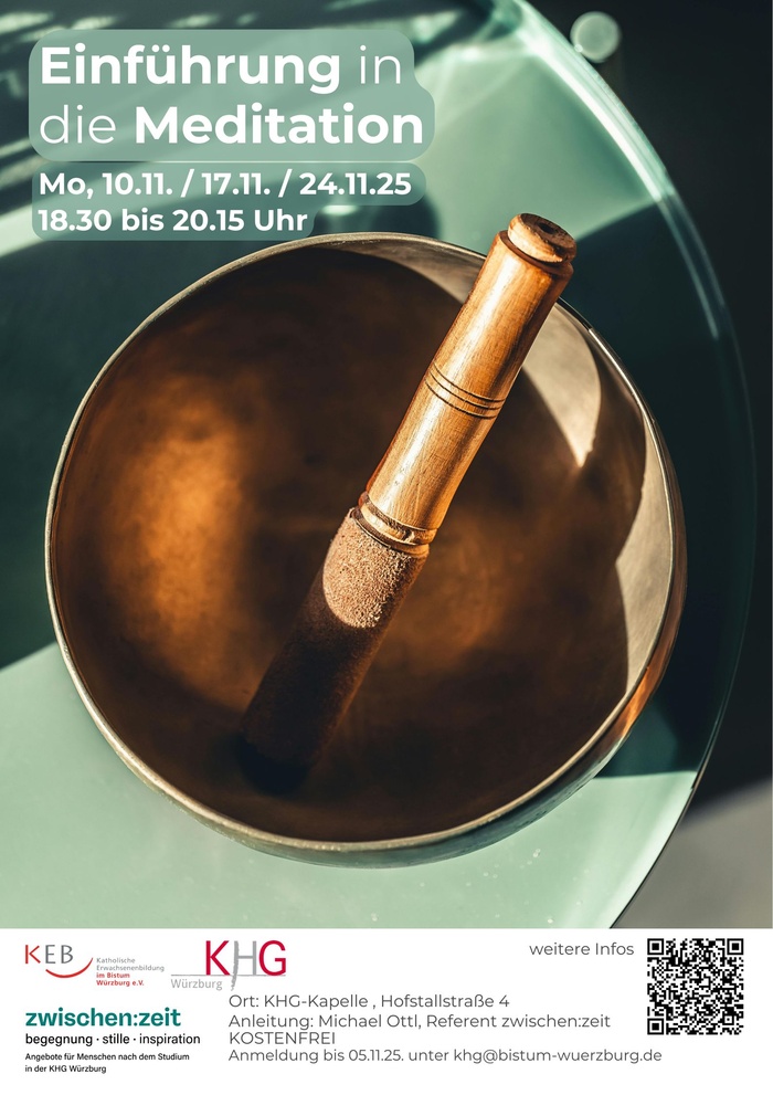 Meditationmöchte als spiritueller Weg zu Achtsamkeit, Gelassenheit, innerer Ruhe und der Erfahrung Gottes im eigenen Leben führen. Der Kurs vermittelt Theorie und Praxis der Meditation sowie das „Sitzen in der Stille“. Er führt in die Grundhaltung der Meditation ein: waches, absichtsloses Verweilen in der Gegenwart.
