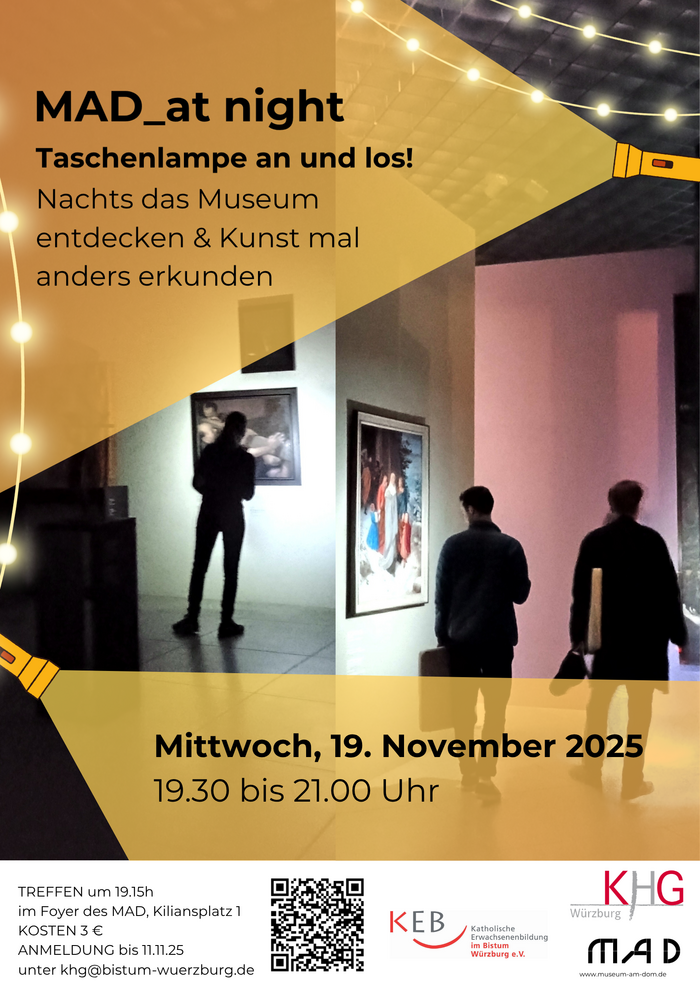 Im grauen November bringen wir Farbe in den Alltag! Wir erkunden das MAD (Museum am Dom) mit seinen Kunstwerken vom 10. bis zum 21. Jahrhundert – und zwar am Abend. Taschenlampe an und die bunten Themenwelten entdecken – was begegnet dir zwischen Skulpturen von Riemenschneider, Barlach oder Kollwitz? Was lösen die Werke von Warhol oder Haring, moderne Grafiken oder Video- und Audioinstallationen bei dir aus?