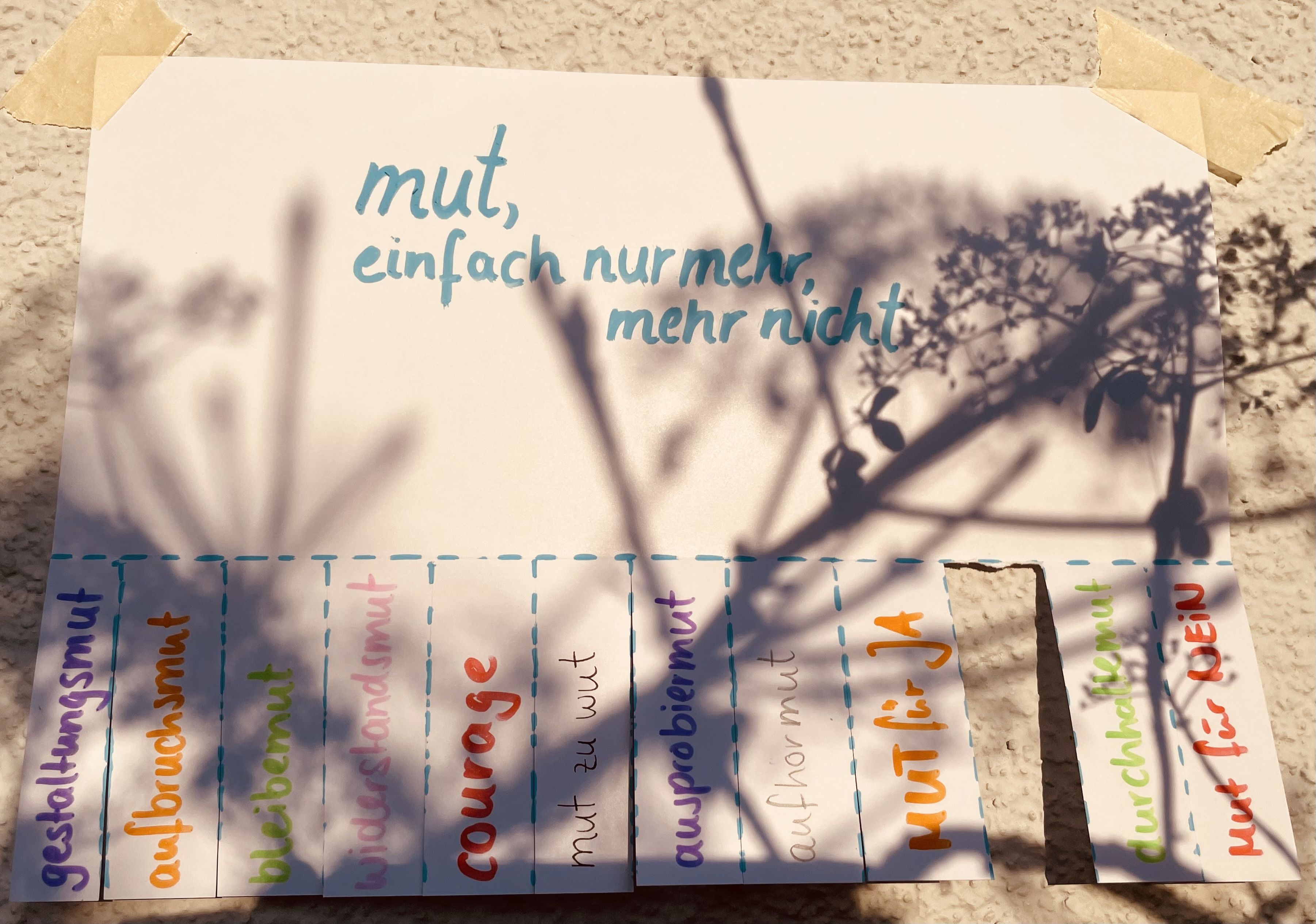 Was ist für dich Mut? Wer ist dir ein mutiges Vorbild? Und wer hat dich angesteckt mit Mut? Wen hast du zuletzt ermutigt? Welchen Mut hast du entdeckt? Und welchen versteckten Mut ausfindig gemacht?